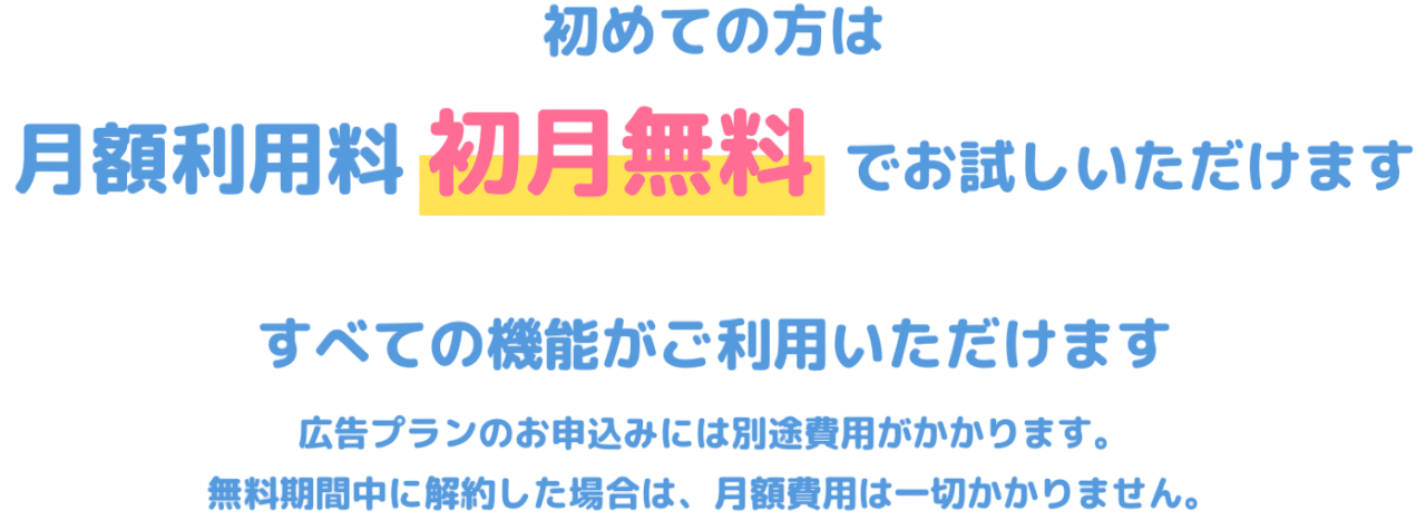 ※ 1日~19日のアカウント登録:当月無料 20日~月末日のアカウント登録:当月+翌月まで無料